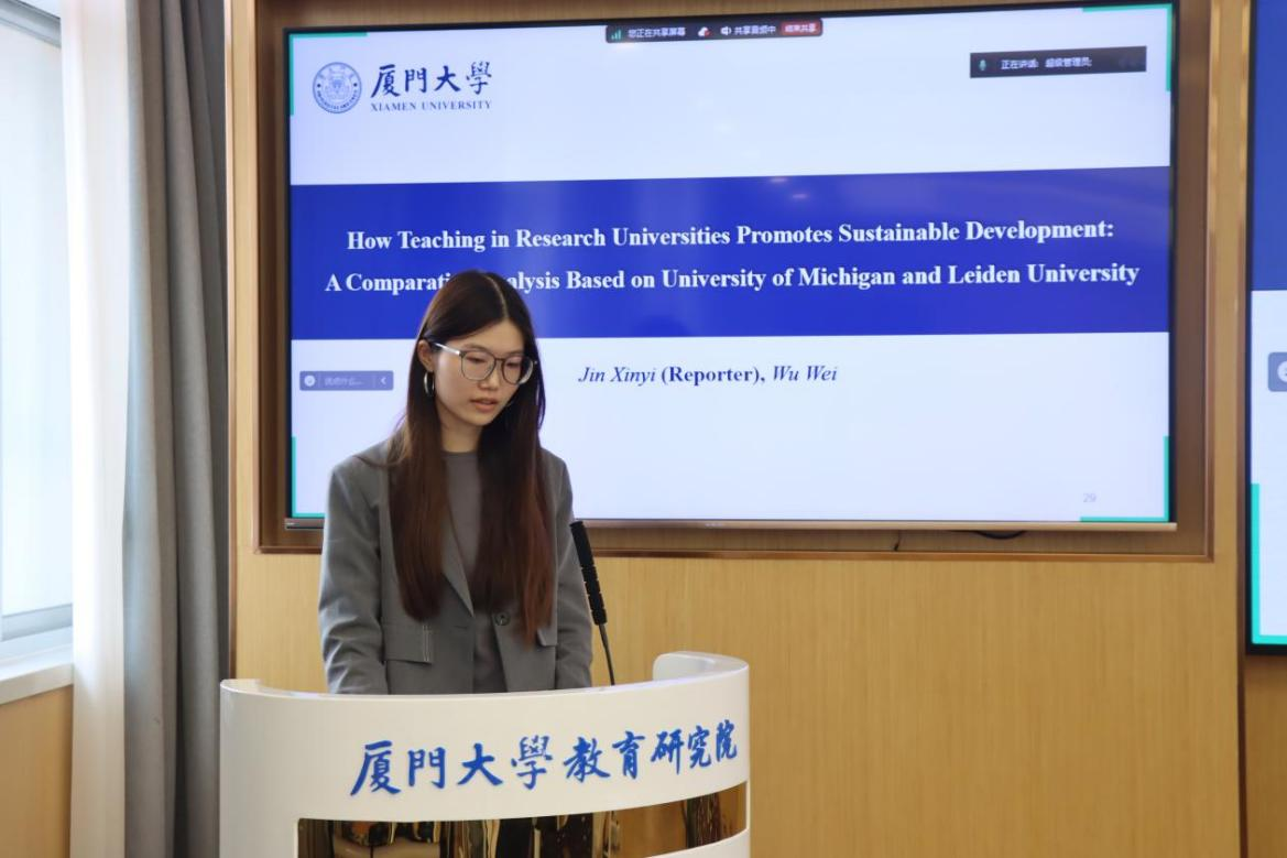 随后,暑期赴美国参加第十八届世界比较教育大会的2022级博士研究生黄丹阳和2022级硕士研究生金心怡分享了参会经历以及研究内容。黄丹阳分享了与导师吴薇教授合作的《荷兰高等教育普及化发展进程及影响因素探析》研究报告,从荷兰高等教育普及化发展进程、高等教育发展过程中的影响因素和结论三方面展开。金心怡分享了与导师吴薇教授合作的《研究型大学的教学何以促进可持续发展——基于密歇根大学和莱顿大学的分析》研究报告,重点探讨了研究型大学的可持续发展教学活动、如何为学生提供全面的教育体验等内容。