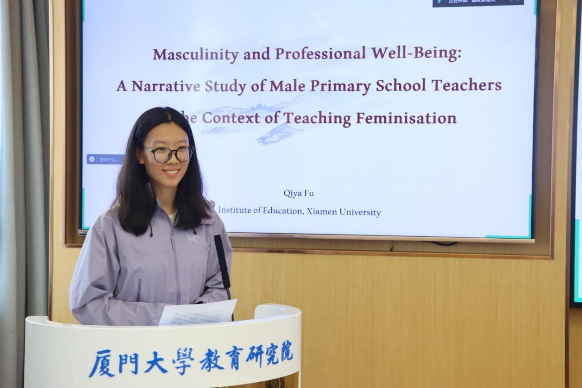 最后,暑期赴英国参加第六届剑桥中国教育论坛的2023级博士研究生杨洋和2023级硕士研究生傅其娅分享了参会报告内容。杨洋的《理工科直博生科研能力增值的影响因素研究:基于38所“双一流”高校直博生调查的实证分析》报告认为,影响理工科直博生科研能力的重要因素包括环境、个人、教学质量和学校资助等多个方面;傅其娅的《职业女性化背景下小学男教师职业幸福感的叙事研究报告》,探讨了性别在教育领域中的影响。