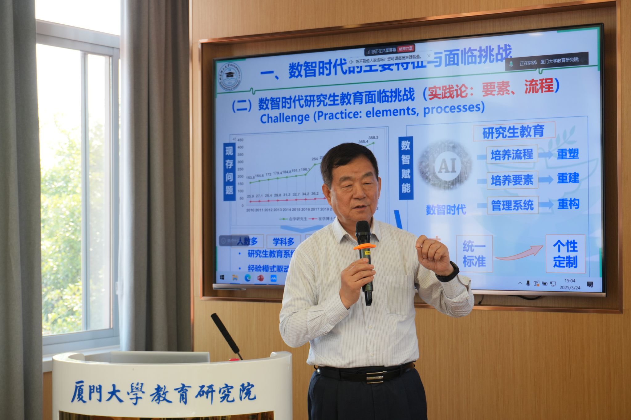 2025年3月24日,中国学位与研究生教育学会副会长兼学术委员会副主任王战军教授应邀开展题为《数智时代研究生教育发展走向》的南强学术讲座。厦门大学教育研究院党委书记刘振天教授主持报告,并为王战军教授颁发厦门大学南强讲座纪念碑,300多人通过线上和线下相结合的方式参会。