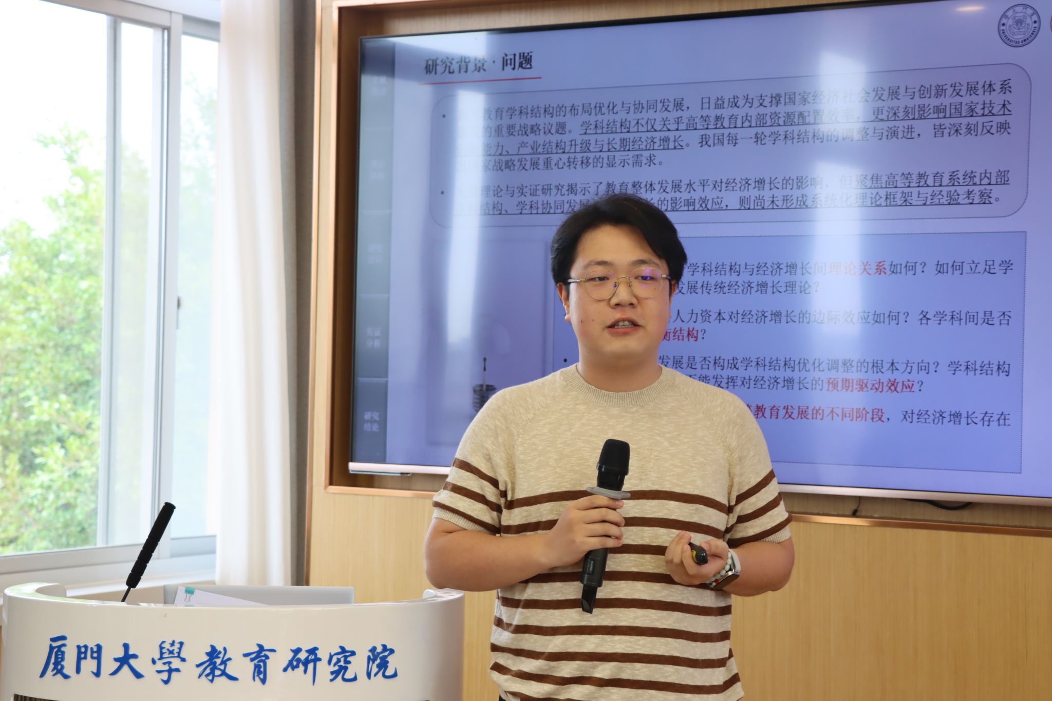 北京大学访学博士生何元皓作了题为《迈向协同发展:高等教育学科结构与国家经济增长》的报告。研究立足现实问题,结合人力资本理论,聚焦高等教育学科结构与国家经济增长的互动关系,构建了“数量替代”与“质量互补”双重机制下的学科协同发展模型。通过跨国面板数据实证分析,研究揭示了不同学科结构对经济增长的差异化影响,并据此提出政策建议,包括优化学科资源配置、促进跨学科协同创新等,以推动高等教育与经济发展的动态适配。