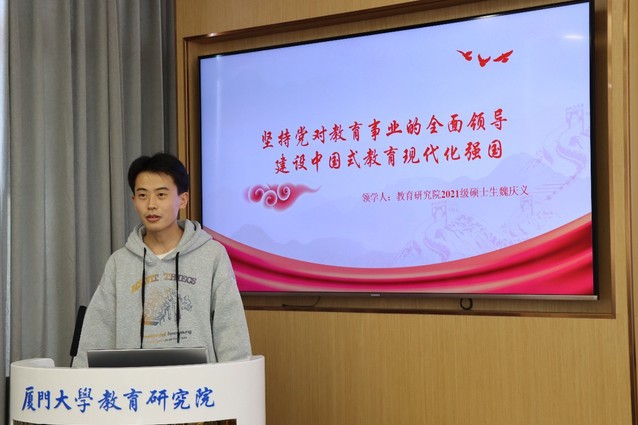 为深入学习宣传贯彻党的二十大精神,把全院师生的思想和行动统一到党的二十大决策部署上来,2022年11月7日下午,厦门大学习近平总书记关于教育的重要论述研习社在黄宜弘楼502报告厅举办主题为“党的二十大精神进社团·教院青年说—坚持党对教育事业的全面领导,建设中国式教育现代化强国”首期读书交流会。院党委书记刘振天,副院长王洪才,党委副书记姚有新、研习社指导教师乔连全,团委书记赖珊珊,研习社全体成员,学生党支部代表参加了本次读书交流会。会议由研习社副社长李歆睿同学主持。