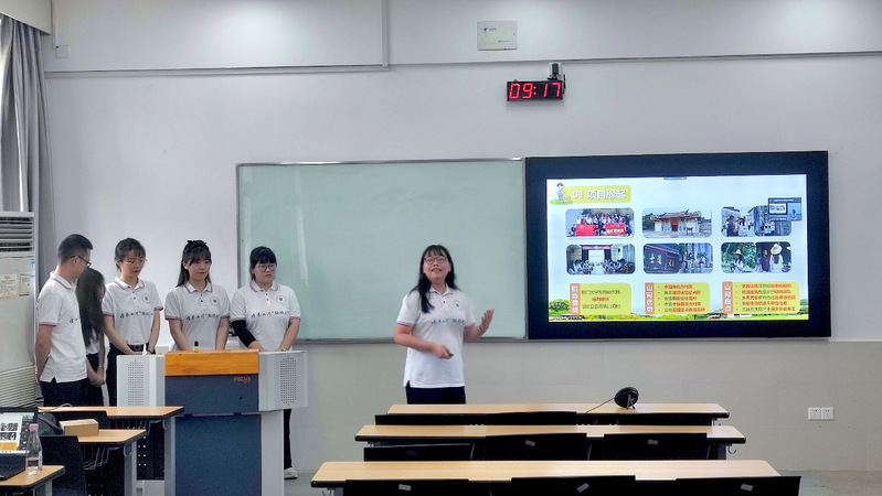 决赛中项目团队在第四位出场,由凌鹊向评委老师介绍项目的具体情况。本项目主要源于厦门大学教育研究院对诏安县西潭镇山河村结对帮扶的基础,意图依托山河村中国传统古村落和省级历史文化名村的优势,改变山河村存在文教优势无法发挥、农业生态资源整合性差的问题。项目结合国家《关于全面加强新时代大中小学劳动教育的意见》、《大中小学劳动教育指导纲要》等文件对于劳动教育的政策要求,厦漳地区学校对劳动教育实践基地的现实需求和本院自身在教育领域的专业优势,以“田间地头、教育赋能”为指导思想,以“带动农民就业、实现农民增收”为主要目标,开创劳动教育助力乡村振兴新模式。具体而言,项目依托乡村现有自然资源,因地制宜、因村设课,研发专属劳动教育特色课程,面向大中小学生开展劳动教育实践,同时促进农村经济持续稳定发展,实现继精准扶贫后农民的二次腾飞。