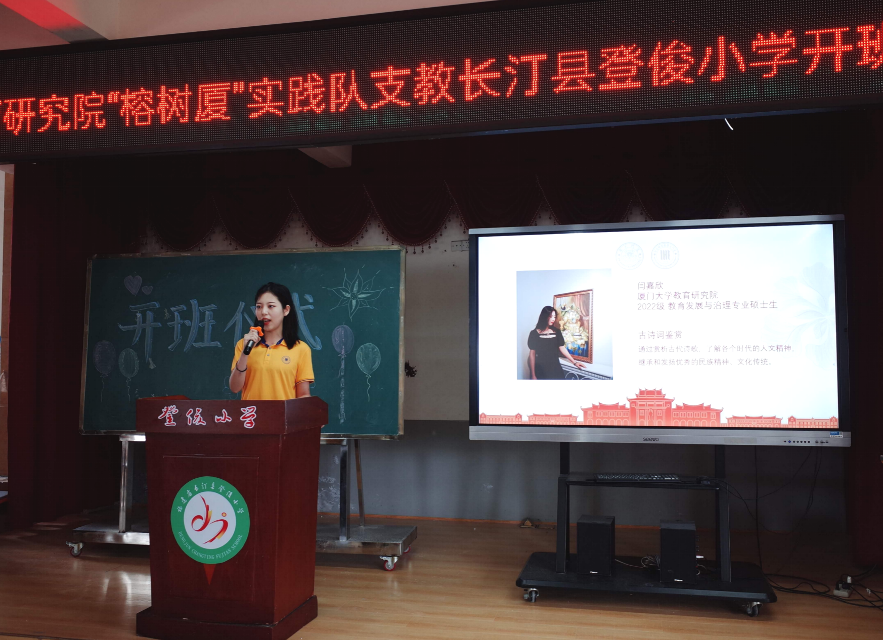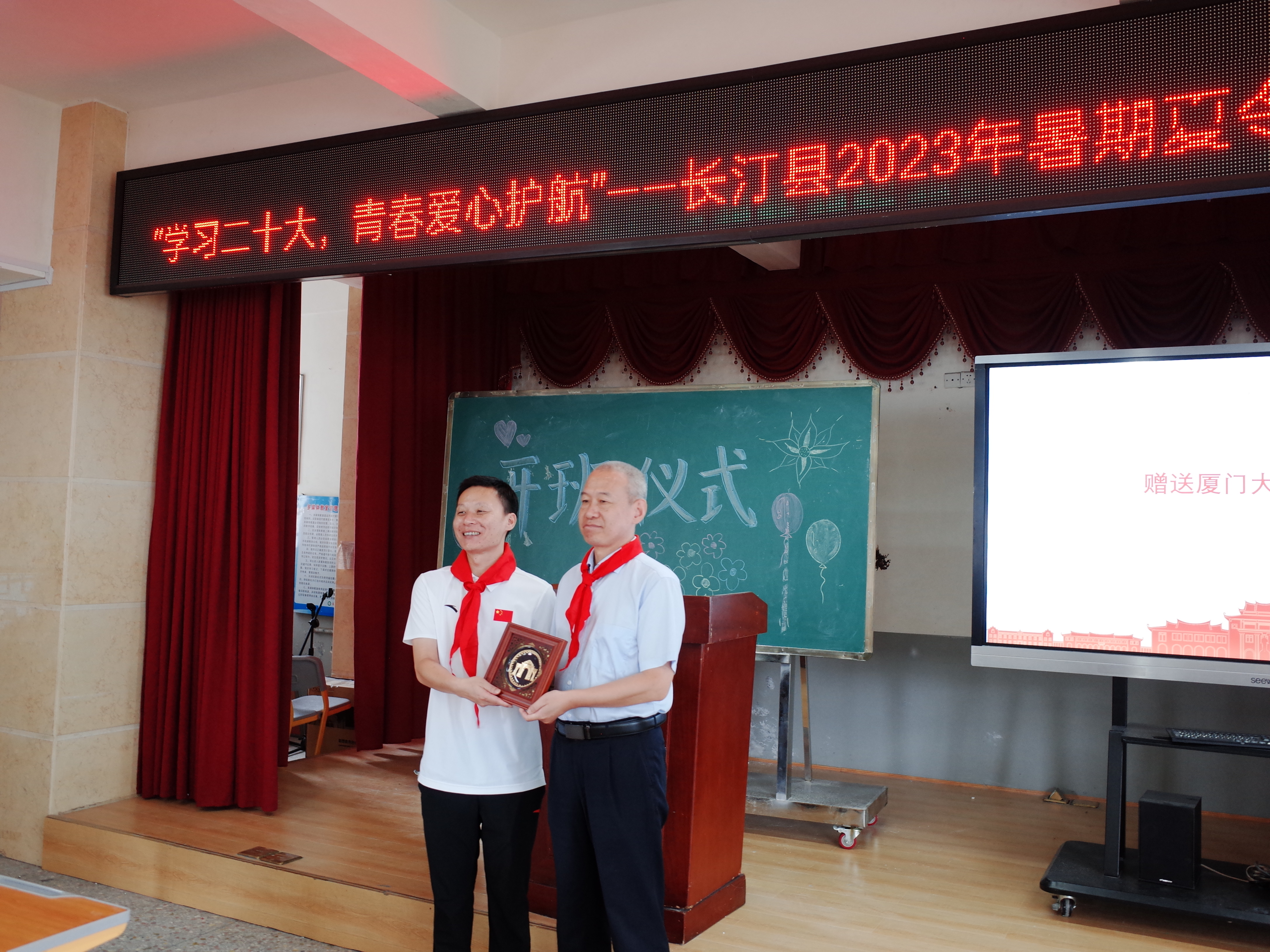 2023年7月3日上午,我院“榕树厦”暑期社会实践队走进登俊小学并举行简短的开班仪式。我院党委副书记姚有新、团委书记赖珊珊,长汀县登俊小学校长刘晓明、德育处主任陈冬水,以及“榕树厦”暑期社会实践队全体队员和登俊小学师生代表参加了开班仪式。仪式由“榕树厦”实践队队员赵一博主持。