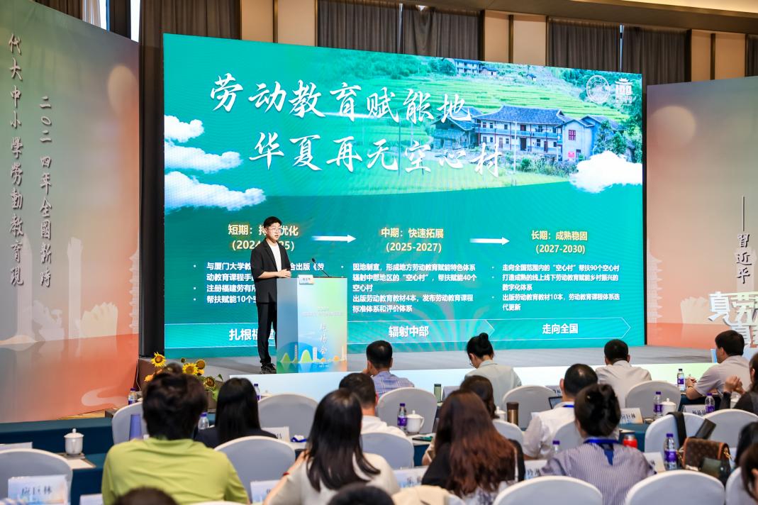 在17日下午的学校典型经验分论坛中,我院2021级硕士生刘景华代表团队作了题为《劳动教育赋能乡村振兴的厦大方案》的报告,对项目团队、项目方案以及团队探索劳动教育赋能乡村振兴的重点实践成果进行介绍,引起了在座专家、学者及一线教师的热烈反响。