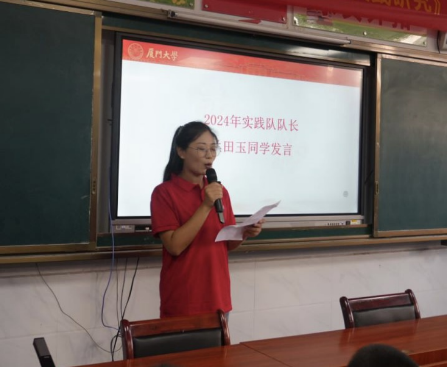 “榕树厦”实践队队长兰田玉同学在开班仪式上介绍了厦大教育研究院的基本情况、学科特色、实践队成员的专业背景和准备的课程要点,表达了履行好队长职责,带领队员们圆满完成支教任务的信心和决心。