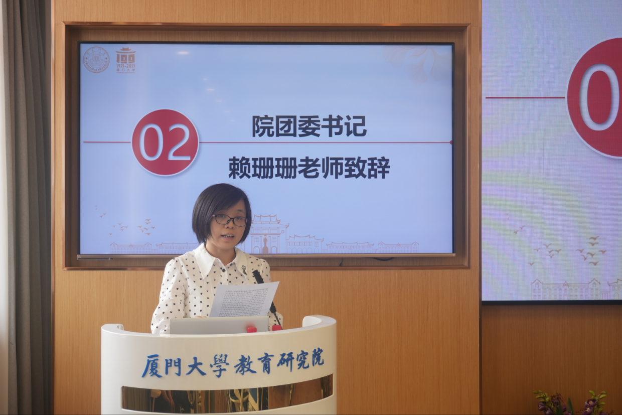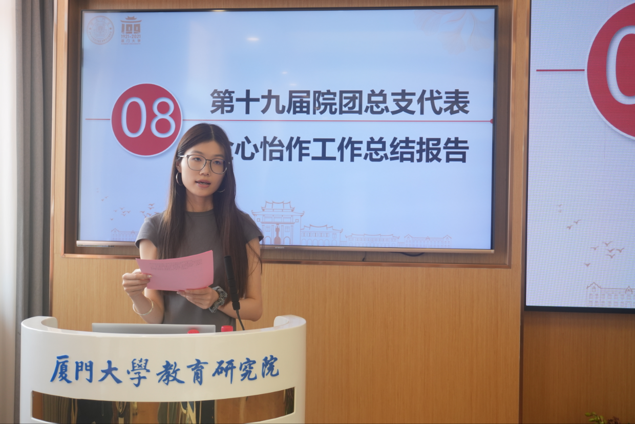 教育研究院第十九届团总支书记金心怡同学从加强思想建设、加强组织建设、落实权益保障、搭建服务平台和坚持从严治团等方面向大会作团总支工作报告,展示了我院共青团工作取得的成绩。