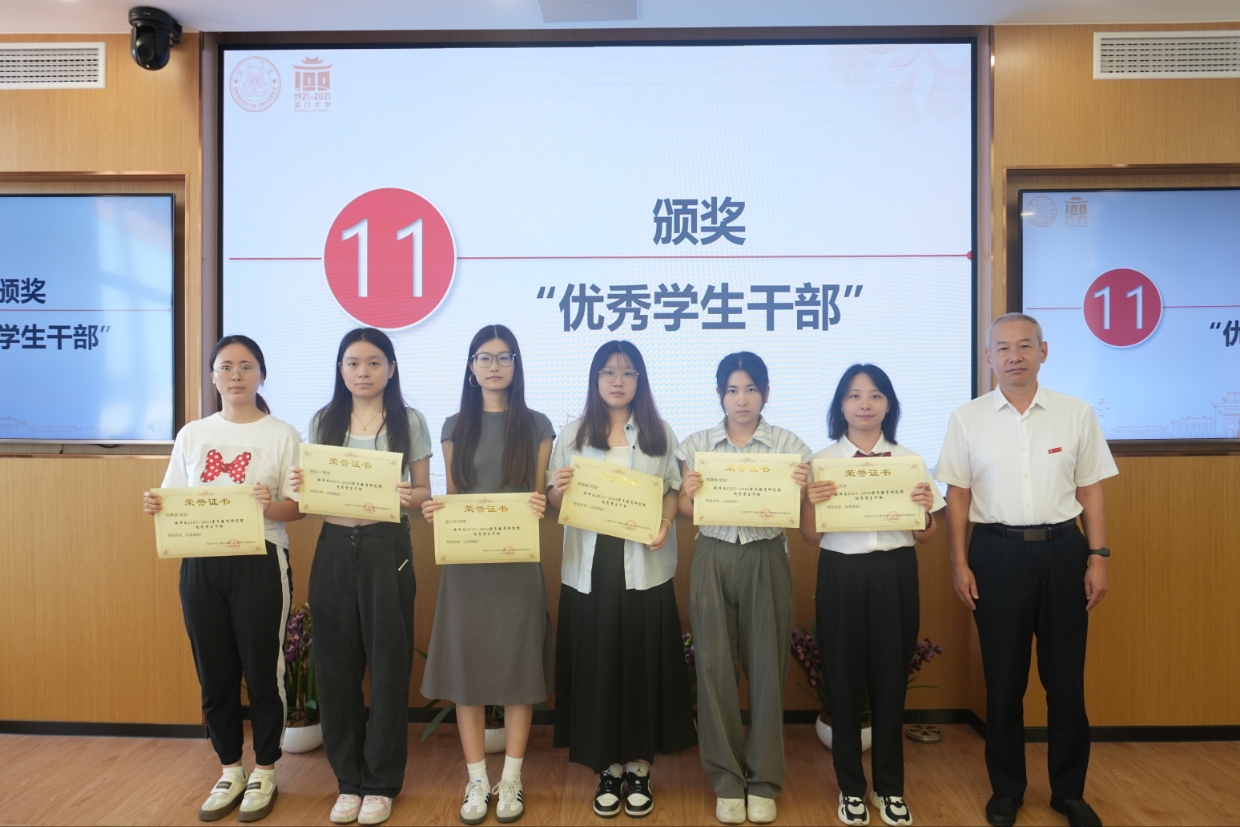 赖珊珊向教育研究院学生干部颁发任职证明,姚有新为“优秀学生干部”获得者颁奖。
