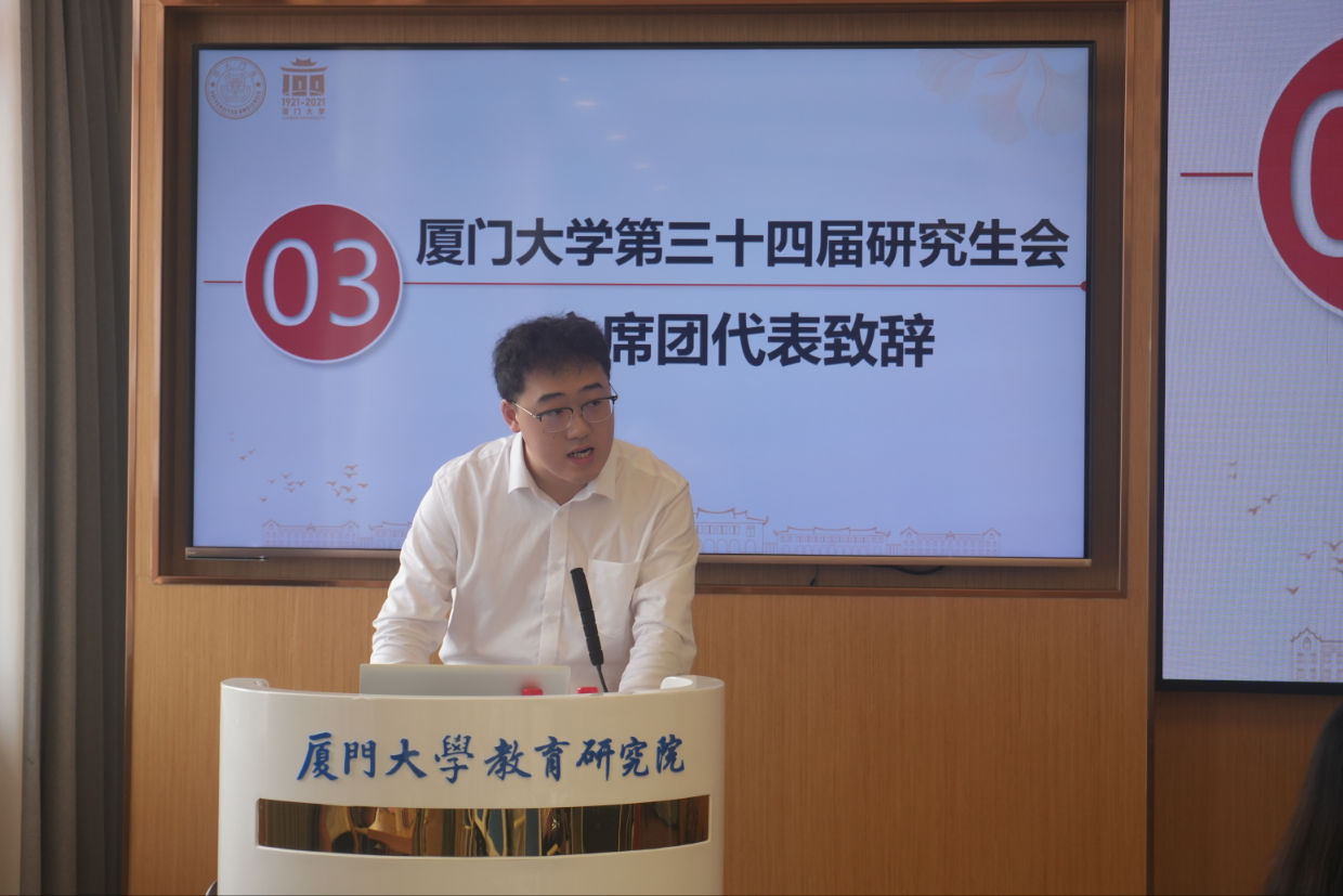 厦门大学研究生会主席邸子瀛同学在致辞中肯定了教育研究院研究生会在校院互动、跨院交流、学术活动、生活权益、社会实践、校园文化等方面的成绩,他希望新一届研究生会再接再厉,在继承优良传统和深化改革创新的基础上永葆生机、不断突破。