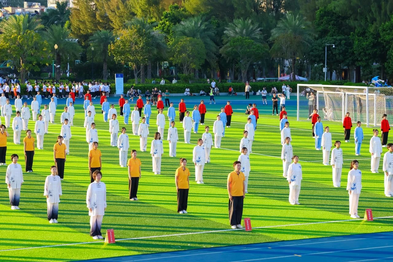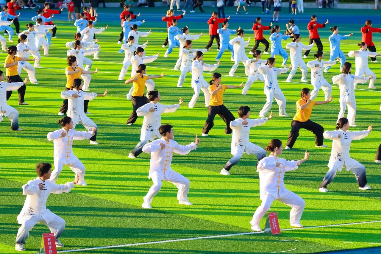 当校运会接近尾声,闭幕式拉开帷幕。教育研究院同学们带来了精彩的八段锦表演,为本次校运会画上了一个完美的句号。他们的动作整齐划一,眼神专注而坚定,抬手、转身、弯腰、踢腿,每一个动作都精准到位。