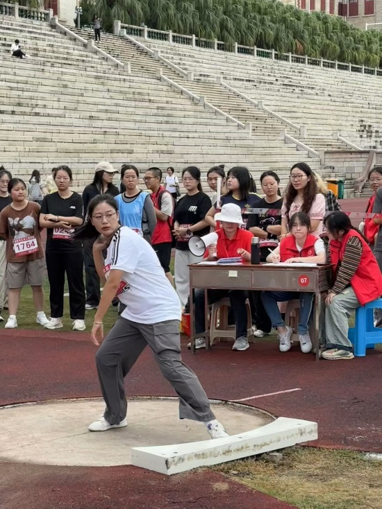 铅球运动员眼神专注,在准备投掷的那一刻,将全身的力量都集中在手臂和腰部,宛如一座即将喷发的火山。兰田玉同学在女子铅球赛中勇创佳绩。