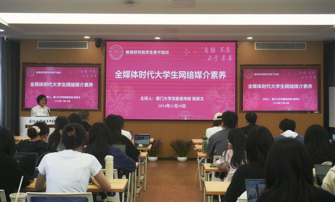 全媒体时代对当代大学生的核心素养提出了更为全面、广泛的要求,为贯彻落实“时代新人铸魂工程”,进一步提高学生的网络安全意识和媒介素养,增强教育研究院学生骨干队伍的综合素质,11月18日,教育研究院邀请厦门大学党委宣传部陈联文老师为学生骨干开展专题培训。教育研究院研究生会全体同学、各学生党支部支委、各班级班委、院学生助理团队等参加培训。培训由教育研究院团委书记赖珊珊主持。