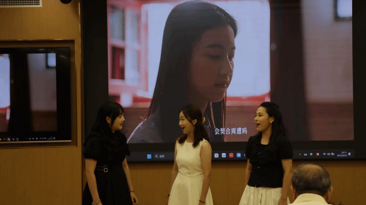 随后,杨德睿、周涵、冯瑞雪三位同学联袂献唱《启程》。这首充满青春活力的歌曲经过他们的重新编排,加入了和声,展现了对毕业生们的美好祝福和对未来的美好憧憬。