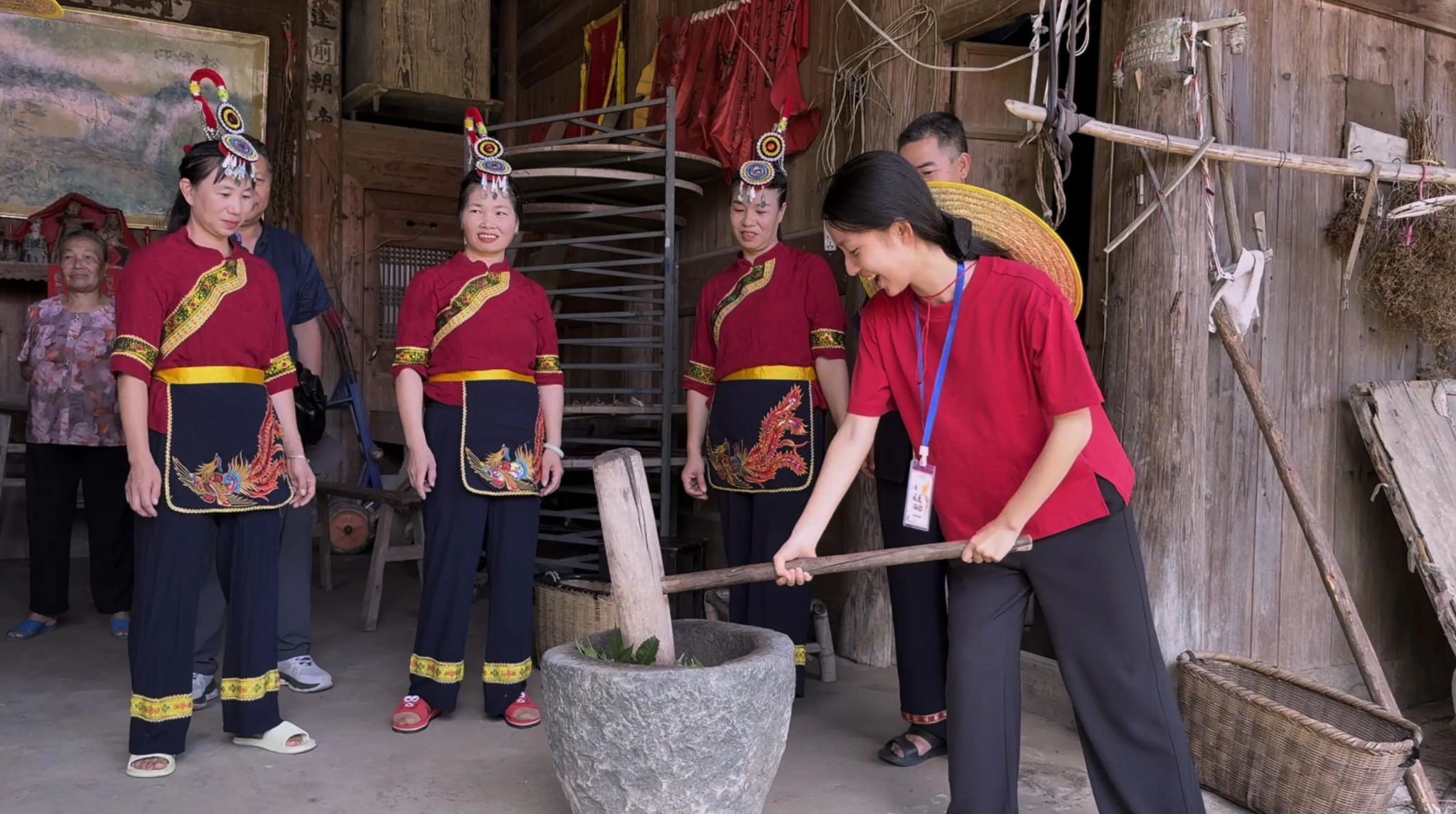实践队跟随建阳漳墩镇乌米饭制作技艺区级非遗代表性传承人钱尾金,学习从采叶、捣汁到蒸煮成饭的全过程,亲身体验畲族饮食背后的千年智慧。捣叶取汁中,队员们聆听畲歌、“三月三”习俗讲解,切身感受到非遗活态传承的当代价值与文化魅力。