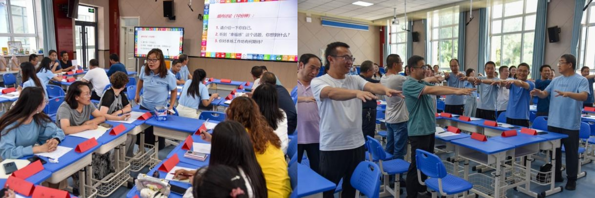 传递幸福力量,赋能教师心理.为突破县中教师专业成长的现实困境,实践队开展了以“提升你的幸福感”为主题的可持续发展教育工作坊。活动伊始,蔡秀英博士带领全体教师完成了一套松静养心太极运动养生操,随后,引导教师自我评估幸福感指数的变化,并通过生动案例与趣味互动,深入浅出地介绍幸福感的多元构成、幸福感的表现,以及提升幸福感的途径。