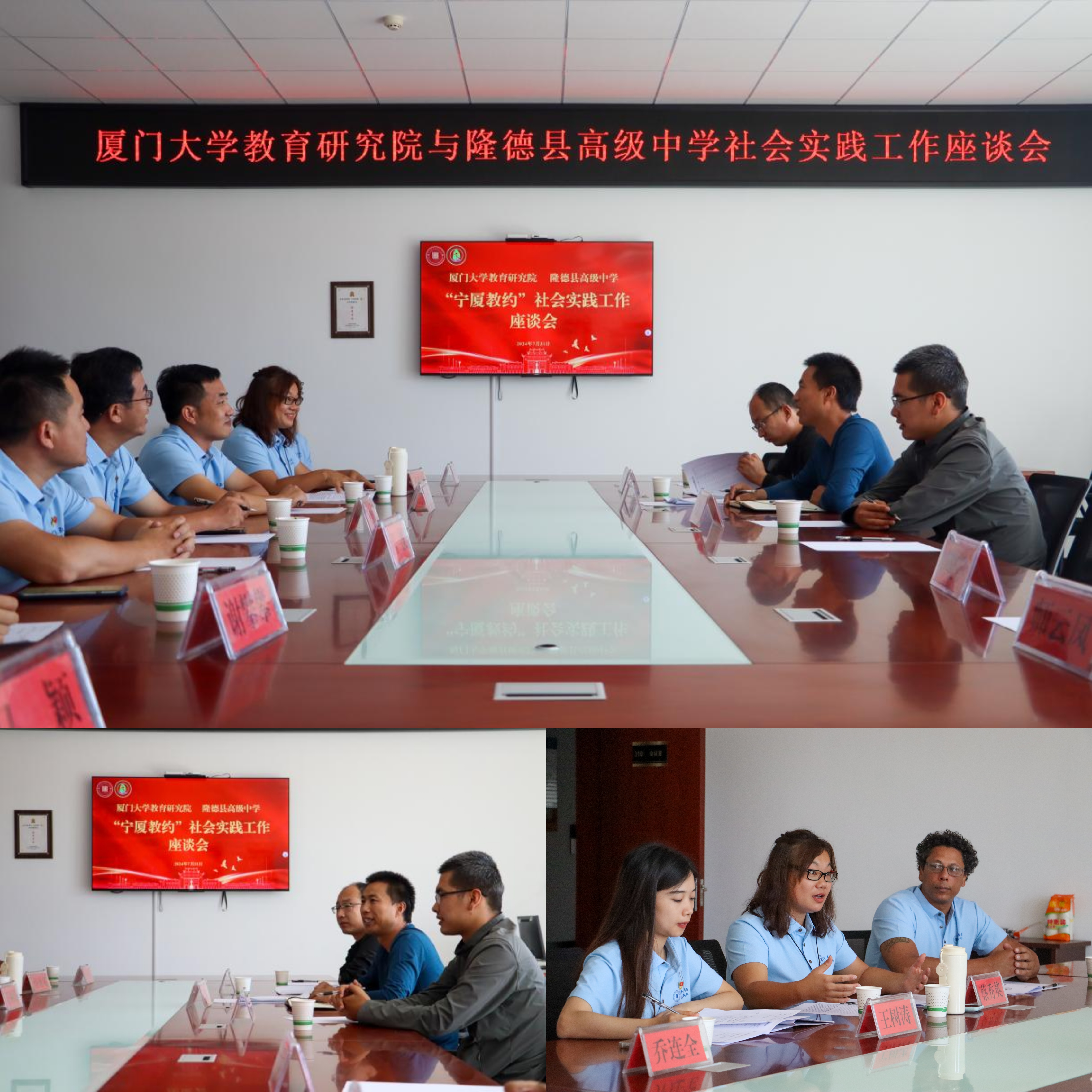 7月31日,实践队与隆德县中学教育集团座谈会在隆德县党校召开。会议由实践队领队、原厦门大学挂职隆德县张树村第一书记吕铖主持。厦门大学教育研究院副院长王树涛教授、乔连全副教授、实践队队长谢攀攀、骨干队员,以及隆德县中学集团副校长于暄、教师骨干出席会议。在交流中,双方达成合作共识,将以此次活动为契机,深化合作,为隆德县教育振兴做出贡献。
