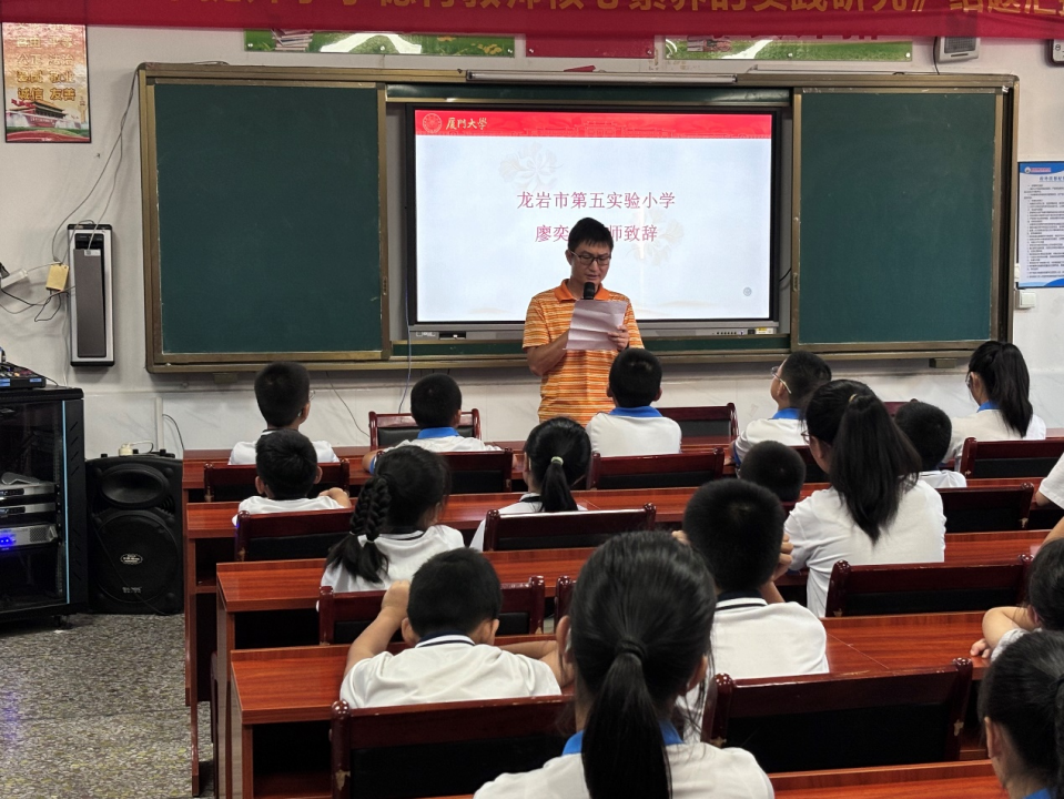 厦门大学教育研究院党政辅导员黄仁伟表示,感谢新罗区团委和龙岩市第五实验小学师生的大力支持,为实践队同学提供了锻炼的平台,让同学们有机会走上讲台,更加深刻地理解教育的内涵,践行教育的使命,让同学们在这个过程中得到锻炼和提升。他希望实践队员和小学生们在这个过程中教学相长,共同成长。