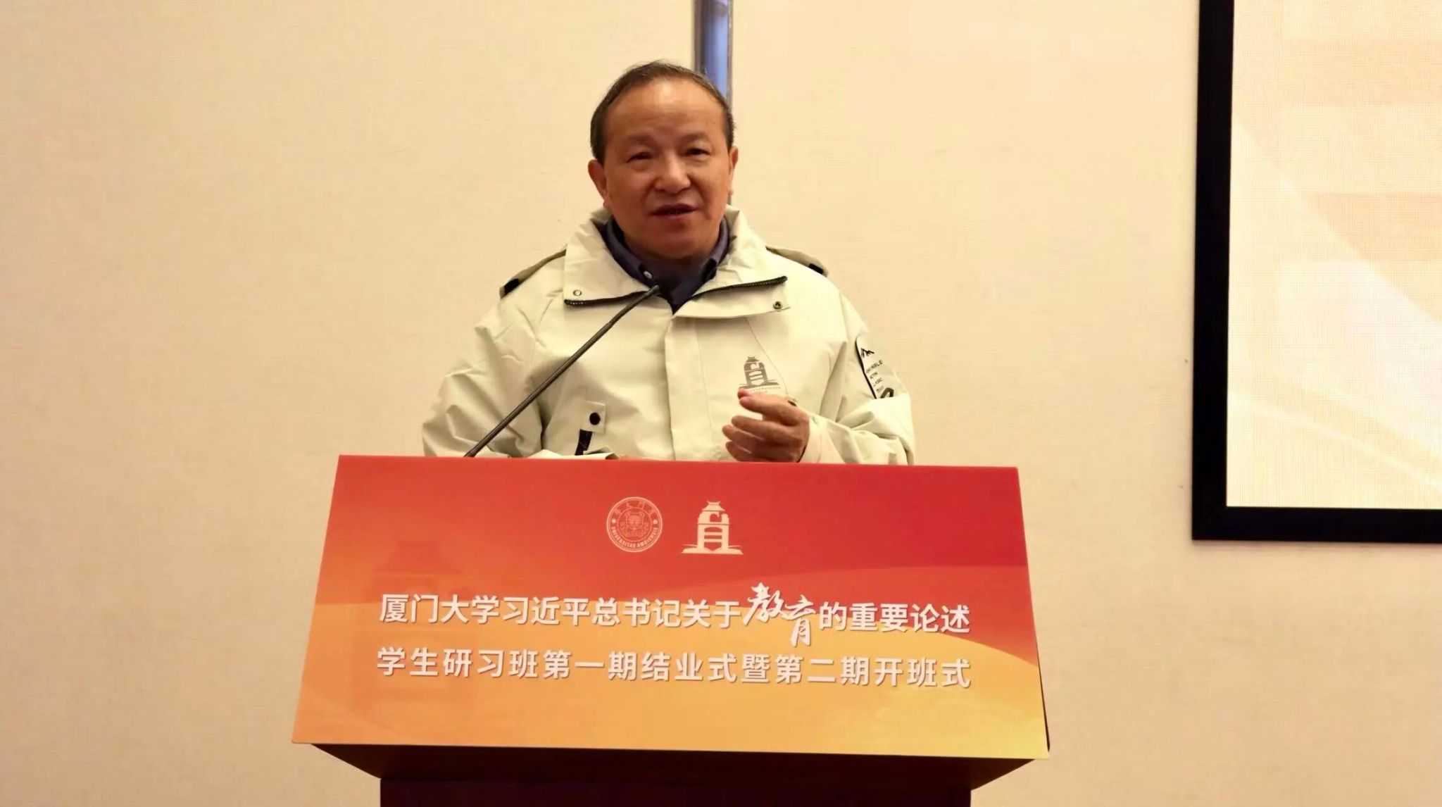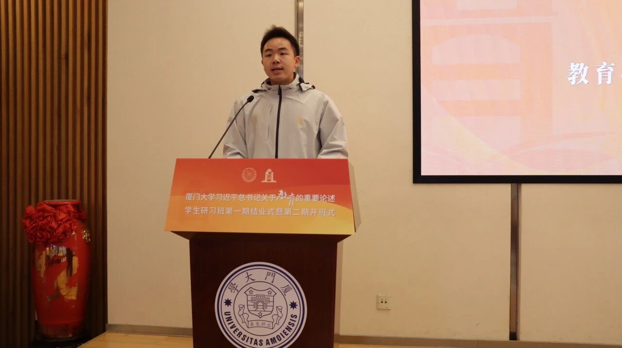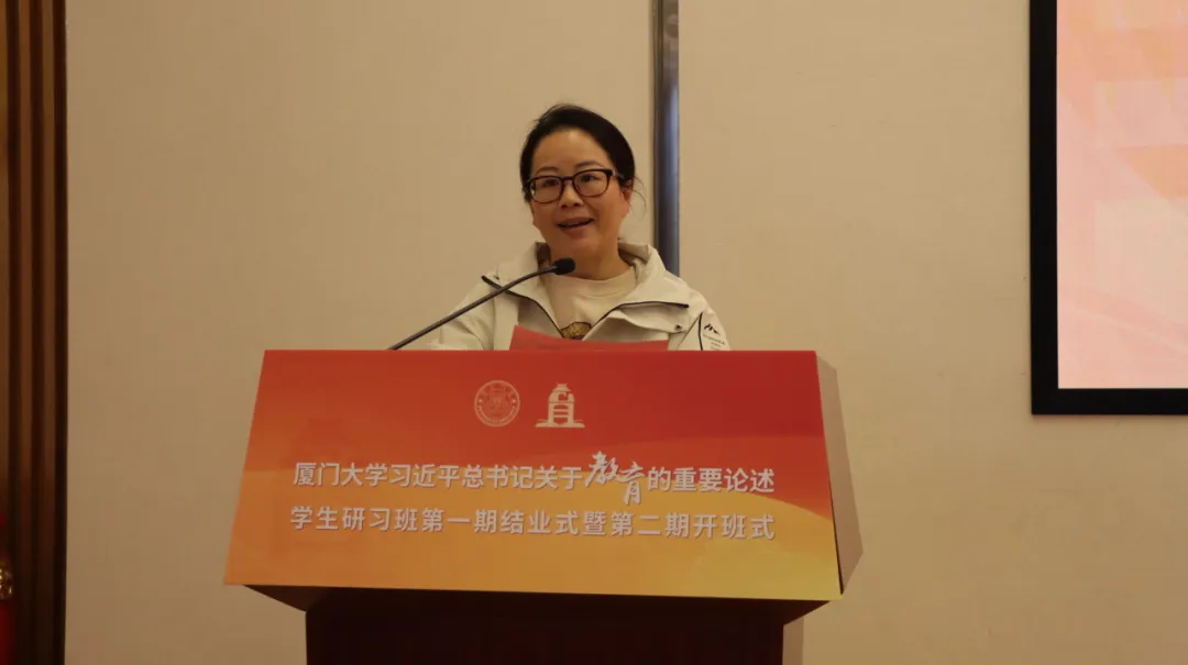 邹海燕对研习班第一期工作进行了全面总结。过去一年,研习班以习近平总书记关于教育的重要论述为根本遵循,集体学习了张荣书记贯彻全国教育大会精神的思政课程,认真聆听邬大光、别敦荣、张建霖等教授的专题授课,构建了“理论研读+专家授课+专题研讨”的三维学习体系;前往福州、厦门集美、深圳等地,打造了“校园研习+企业走访+实地拓展”的多元化实践矩阵;建立“党支部+班委会”双线协同管理模式,配套设立专项经费与学分认定制度,在一站式学生社区打造“教育筑梦研习共享空间”;精心打磨师生宣讲《中国高等教育国际化的“厦大样本”》,在科艺中心两次精彩呈现;累计组织各类交流研讨、主题沙龙近50场次,收到学员提交的读书笔记98篇、学习心得46篇、调研报告6篇,其中4篇调研报告获评优秀。最后,她衷心感谢校党委、学生工作部(处)及所有指导老师的悉心指导与辛勤付出,并热烈祝贺第一期44位学员顺利结业,希望他们能将所学所悟化为前行力量,为中华民族伟大复兴的宏伟事业贡献澎湃的青春力量。