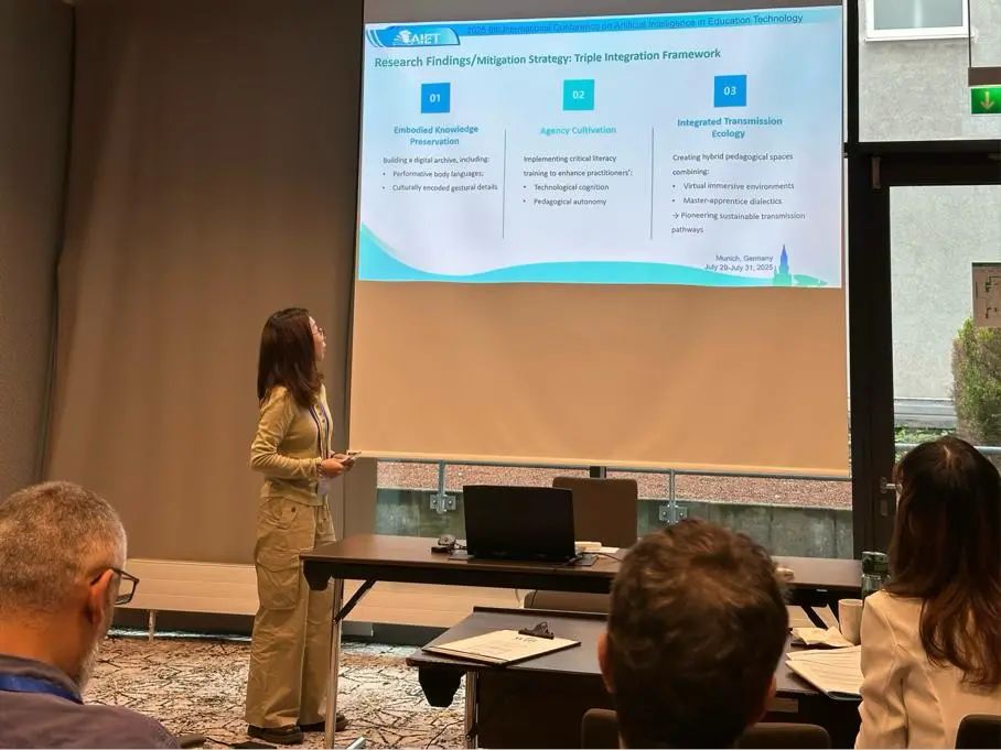 在分论坛教育教学管理国际会议(International Conference on Teaching and Education Management)报告中,硕士生杨德睿作了题为“当人工智能遇上传统:通过人机协作重构中国音乐教育中的体现知识和文化基因”(When AI Meets Tradition: Reconfiguring Embodied Knowledge and Cultural DNA in Chinese Music Education through Human-Computer Collaboration)的报告。该研究聚焦以南音为代表的中国传统音乐教育,探索人工智能技术在传统音乐教育中的应用,以促进其保护、传承与创新的可持续发展;硕士生龙雨作了题为“通过机器学习实现个性化:在中国教育背景下评估DeepSeek的日语辅导系统——跨文化视角下的技术适配与教育创新”(Personalization through Machine Learning: Evaluating DeepSeek's Japanese Tutoring System in the Chinese Educational Context——Towards Technological Adaptation and Educational Innovation from a Cross-Cultural Perspective)的报告。该研究基于东亚语言文化认知特征,分析了AI日语教学在同形词、语法及敬语层面的适配困境,并提出文化-技术双维优化路径,为汉字圈教育AI提供方法论支撑。
