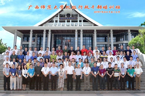 2018年9月25日至29日,由中共广西师范大学委员会主办,厦门大学教育研究院承办的广西师范大学处级行政干部培训班(第一期)在厦门大学开班。广西师范大学党委副书记旷永青,副校长黄文韬、孙杰远,纪委书记莫坷,厦门大学教育研究院党委书记郑冰冰、院长别敦荣出席开班和结业仪式。来自广西师范大学各学院(部)、各单位处级行政干部和工作人员共计81人参加了此次培训。