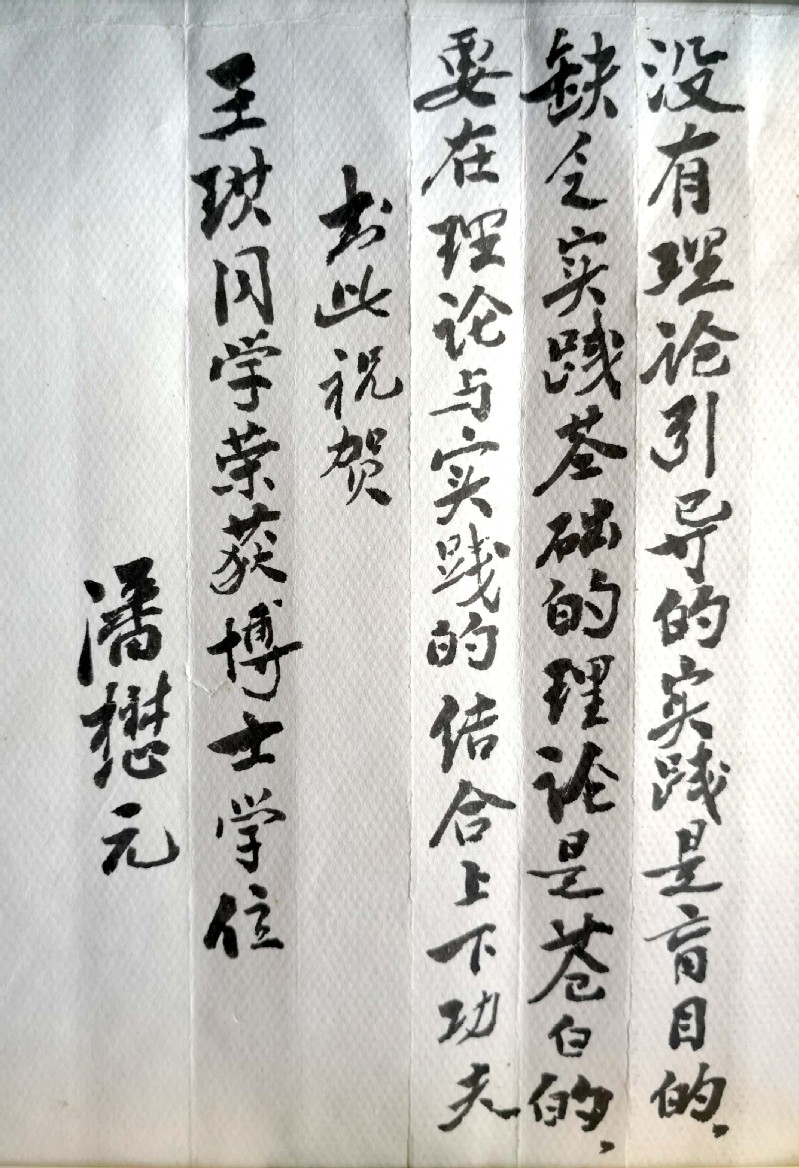 三年学习很快结束,我签约到宁波职业技术学院工作。答辩结束后,我和葛喜艳师姐和先生小聚。饭后回家的路上先生笑着说,“也要给你们饯行”。考虑到一段时间以来先生参加的活动较多,我就开玩笑说,“您太忙了,吃饭太占时间,要不您就送我件礼物,或者给我写几句勉励的话吧。”出乎意料的是,几天后先生打来电话,说“到家里来,有东西送你”。先生送了我了一支帕克钢笔,一帧16K纸大小的题字:“没有理论引导的实践是盲目的,缺乏实践基础的理论是苍白的,要在理论与实践的结合上下功夫。书此祝贺王琪同学荣获博士学位”。此时,除了眼泪打转、说“谢谢先生”外,其他的话竟然再也说不出来。先生要我坐下,说:“当前高职院校的实践探索很积极,但理论研究还很弱,你去宁波职业技术学院正好可以将理论研究与实践结合起来。高职教育将来一定会大的发展,要把去高职院校工作当作事业,千万不能仅仅当作一份工作,更不能当作跳板”。走出先生家门,进入电梯时便难以自己地流出眼泪。三年的学习生活,早已深深感受到先生对学生的爱,“先生把学生当作自己的孩子,把自己的孩子当作学生”也早已是教育研究院的佳话,但完全没想到的是,自己只是临时随口一提,先生真的会为自己毕业题字。先生对学生的教育之爱,已超越了亲情之爱。