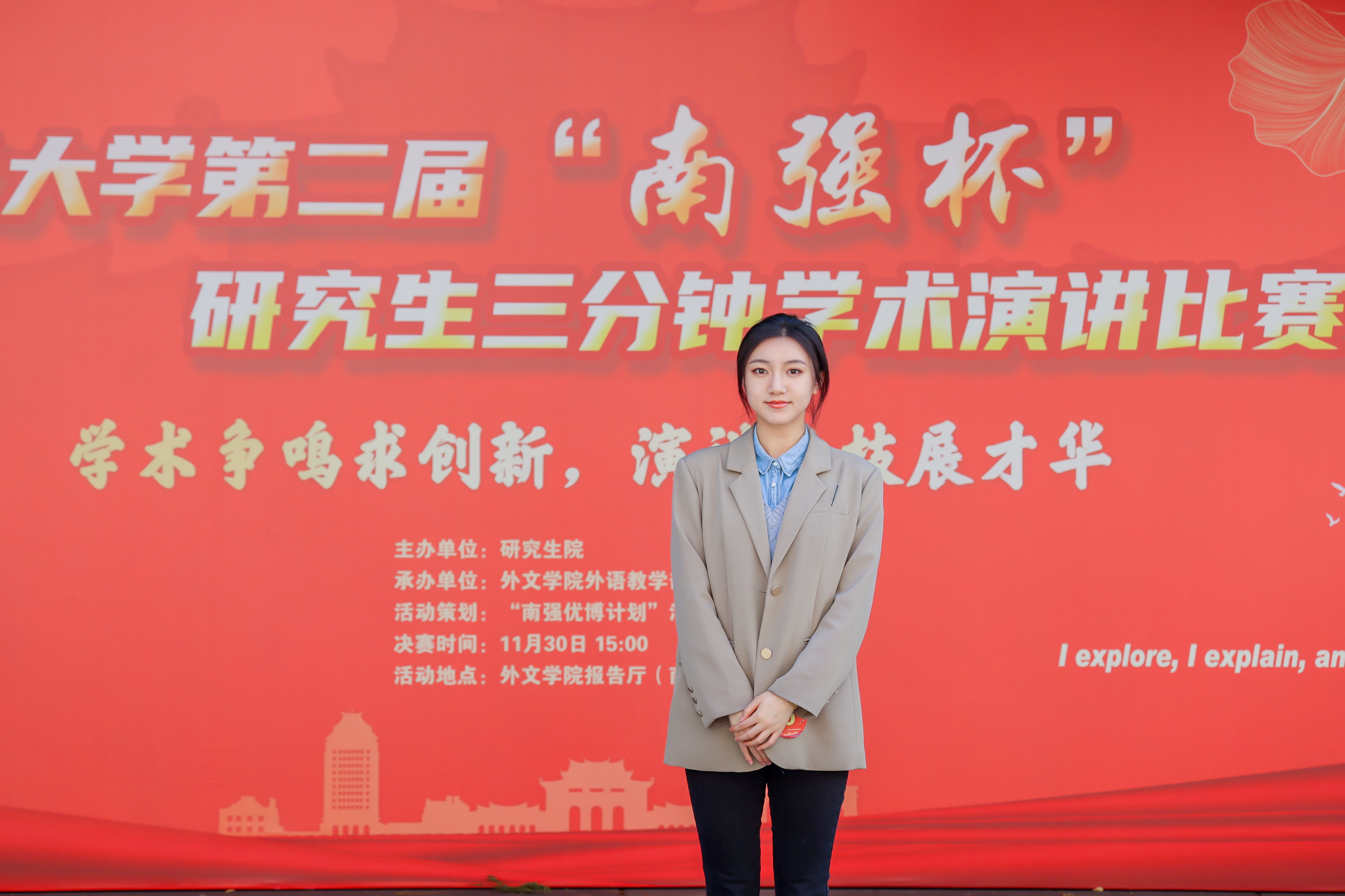 倪羽佳同学在吴薇教授的悉心指导下,不断打磨讲稿和现场排练,进入决赛后得到外文学院刘浩然老师的指导,最终凭借出色的演讲技巧、流利的英语表达、清晰的演讲体系和严密的逻辑思维,赢得了评委的高度评价和观众的高度评价。她的演讲不仅展示了扎实的学术功底,更体现了教院学子自信从容的青春风采,同时,这也是吴薇教授指导研究生在“南强杯”研究生三分钟学术演讲比赛中的第二次获奖。
